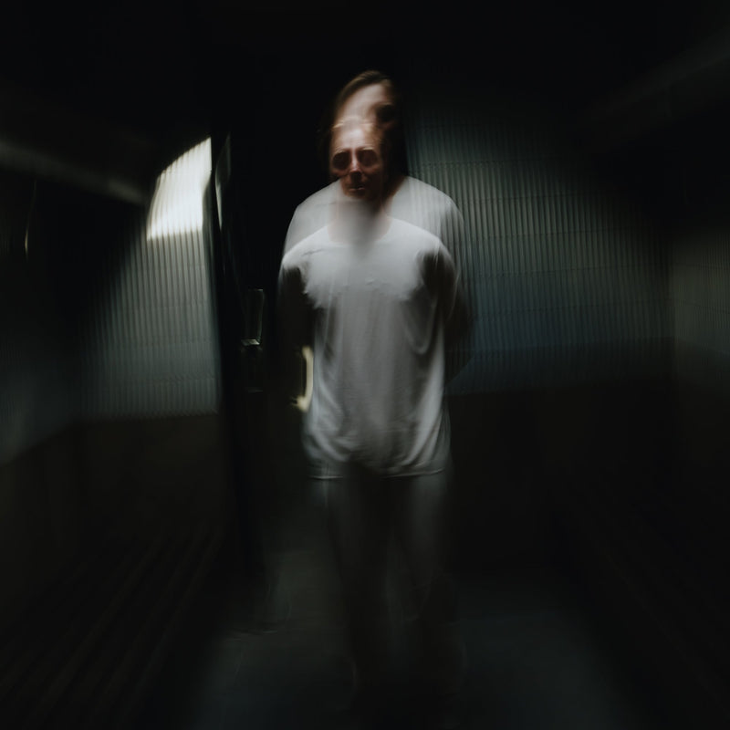 Man wearing a gray t-shirt in a dark room with a textured wall.