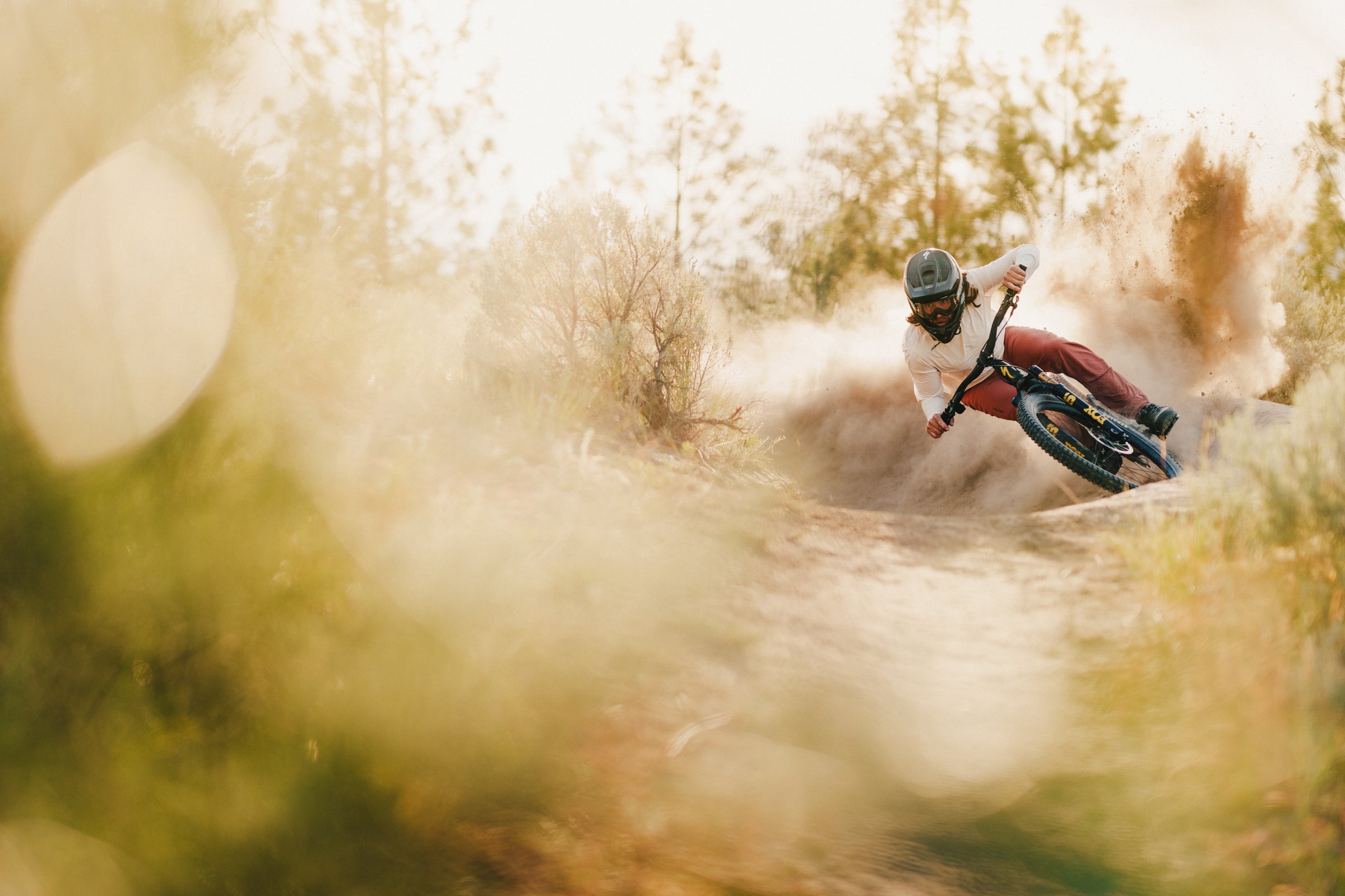 Brett Rheeder riding a downhill mountain bike wearing Signature Augusta Pants and Long Sleeve Jersey